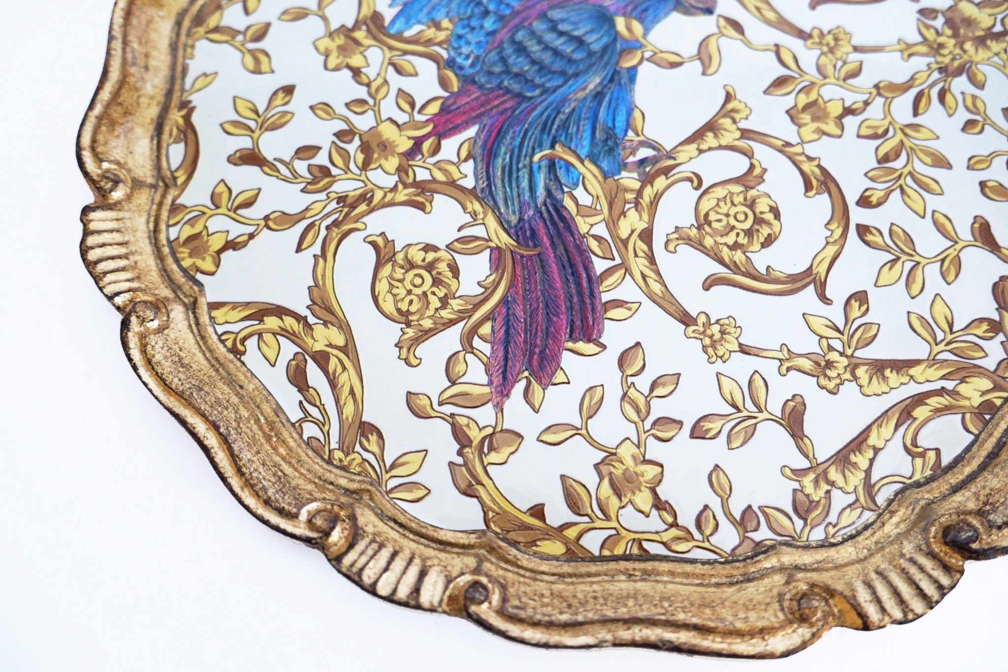 繁花與枝藤交織的構圖,襯托出鳥羽的藍紫與金色,